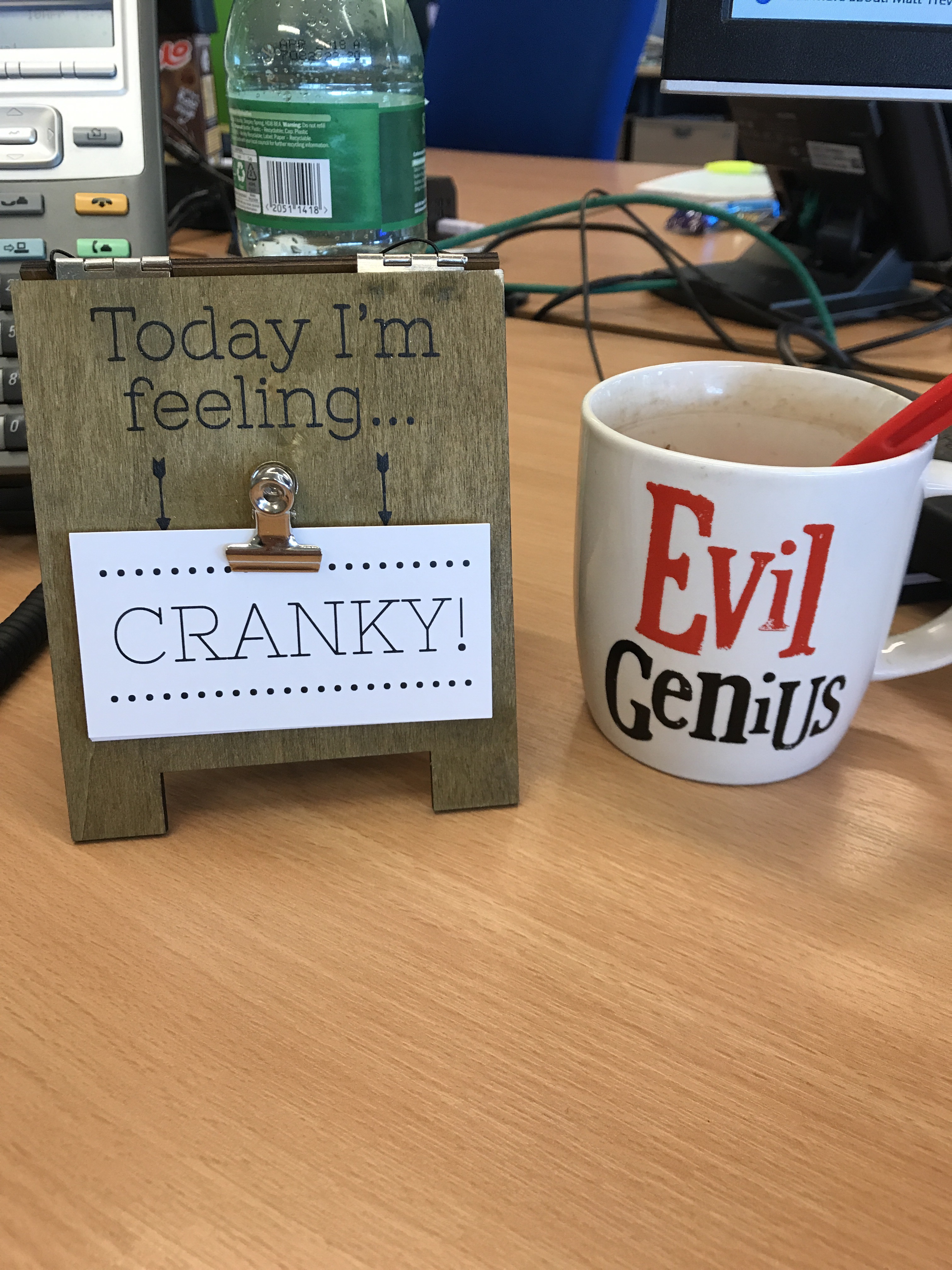 Had a brilliant nights sleep and woke up in a relatively good mood for a Monday morning. Took myself off to the gym and completed my usual hours cardio on the treadmill (I have fallen out of love with the stairway to heaven at the moment). I was powered by the shuffle function on my music library and it was like a little lucky dip of tunes. A quick 10 minutes posing practise and I was off to work. Now I need to inform you of my daily state once I get to work, I am starving to the point of death so I need to eat quickly. However, today I was still in a good mood until someone changed that very quickly with their lack of manners when I held the door open for them. That was it, I went straight to cranky and updated the Niki Feelings board as shown below;
