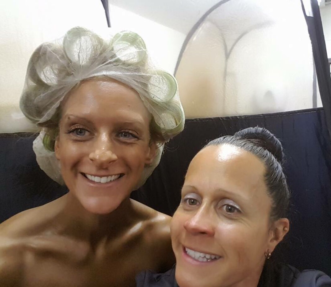 The above is a selfie with the fabulous tanning lady Nicola Gilbert. Off back down to what I thought was a communal changing room but turned out to be the men’s changing room, and it was hair and makeup time. We seemed to have loads of time and then all of a sudden the class before me is on stage and I need to put my bikini on, shoes on, go to the toilet and pump up to go on stage. I had no idea on how to pump up but thankfully Claire Lister and Jason Wilkinson helped me out backstage. I was being fed jelly sweets and wine while pumping my arms using a resistance band that Jason had his foot on in the middle but kept on lifting his foot by mistake so that the band hit me. Next thing I know my name is being announced and I am walking on stage.